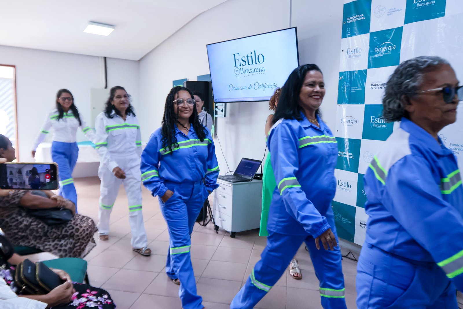 Durante a cerimônia, as costureiras desfilaram com os uniformes produzidos ao longo da capacitação, além de outros produtos confeccionados, como ecobags e porta garrafas, demonstrando na prática as habilidades adquiridas.