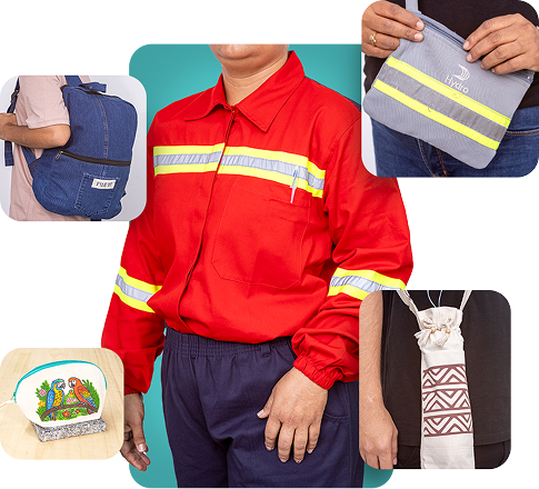 Feita com material reaproveitado de uniformes, é resistente, sustentável e funcional.