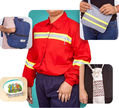 Feita com material reaproveitado de uniformes, é resistente, sustentável e funcional.